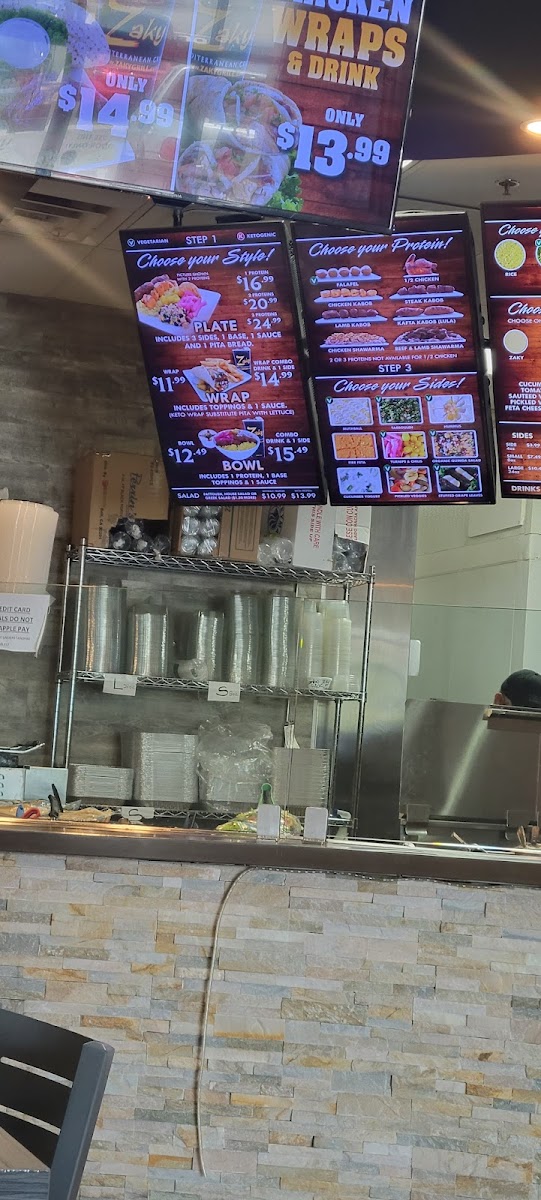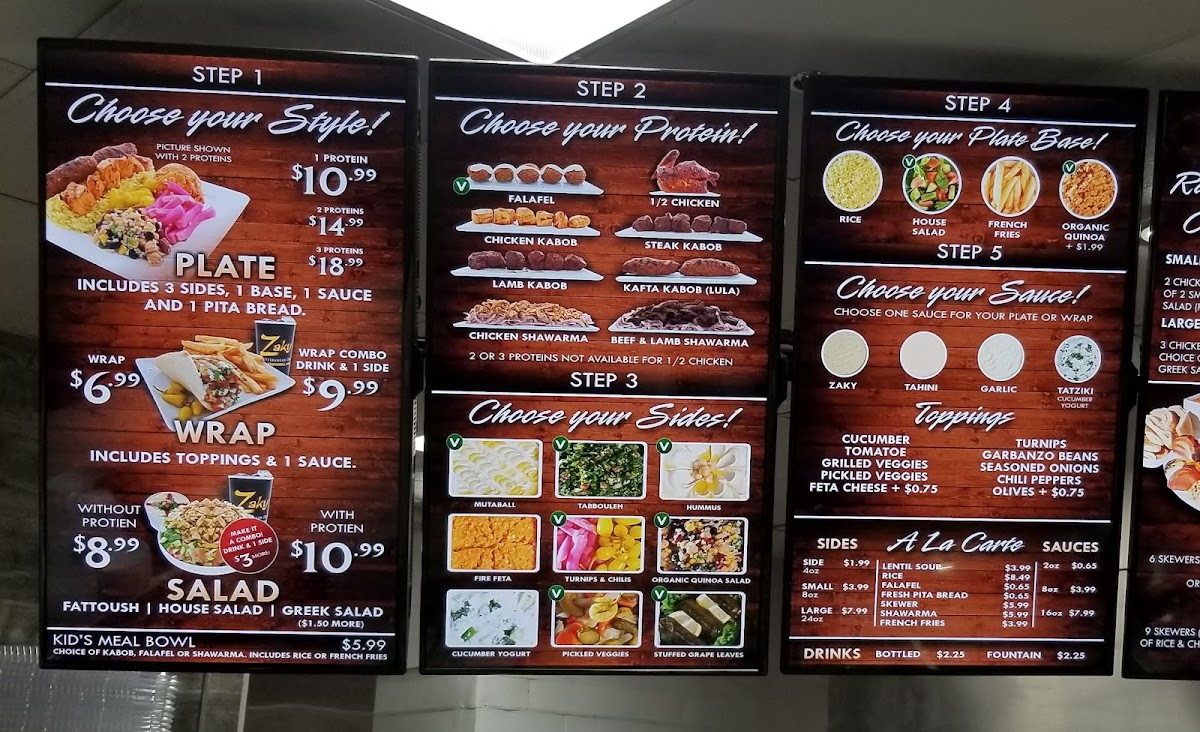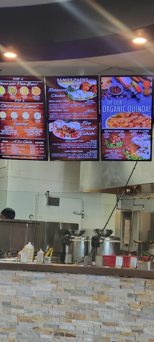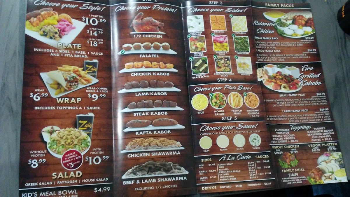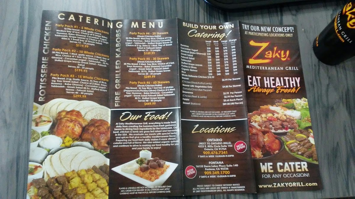 From a reviewer’s perspective, the menu at Zaky Mediterranean Grill, located at 16155 Sierra Lakes Pkwy Ste 140, Fontana, CA 92336, United States, offers a well-rounded and thoughtfully curated Mediterranean dining experience that caters to individuals, families, and groups alike. The restaurant’s Specials such as 2 Rotisserie Chicken Wraps & Drink, Chicken Rotisserie Plate & Drink, and Family Meal are ideal for guests looking for convenient, value-driven options without sacrificing flavor. The core Item Menu is built around versatile choices like Plate, Wrap, Wrap Combo Drink & 1 Side, Zaky Bowl, and Zaky Bowl Combo Drink & 1 Side, allowing diners to customize their meals based on appetite and preference. A major highlight is the Rotisserie Chicken selection, including Full Rotisserie Chicken, Half Rotisserie Chicken - a la carte, and Family Meal, all emphasizing juicy, slow-roasted chicken as a signature offering. For larger gatherings, the Family Packs - Rotisserie Chicken and Family Packs - Fire Grilled Kabobs stand out with generous portions such as Small Family Pack - Rotisserie Chicken w/ 2 small 8 oz sides, Large Family Pack - Rotisserie Chicken w/ 2 large 24 oz sides, Small Family Pack - Kabobs w/ 3 small 8 oz sides, and Large Family Pack - Kabobs w/ 2 large sides and a Greek salad, making them perfect for sharing. The menu also balances hearty proteins with lighter options like the Veggie Platter - Appetizers, available as Small Veggie Platter or Large Veggie Platter. Flavor is further enhanced by house-made Sauces including Zaky Sauce, Tahini Sauce, Garlic Sauce, and Tzatziki Sauce, alongside a Side of Sauce option. Complementary A La Carte items such as Falafel - Catering, Fresh Pita Bread, Organic Quinoa Rice, and Kabob / Shawarma Side, plus classic Sides like Hummus - Side, Tabbouleh - Side, and Stuffed Grape Leaves - Side, round out the experience. To finish, guests can enjoy Drinks like Bottled beverages or Fountain Drink, and a sweet note with Baklava, making the menu a satisfying and cohesive conclusion to the Zaky Mediterranean Grill dining experience.